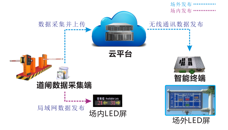 乾乙停车诱导数据发布系统适用于各大停车场的场内外诱导,支持一对多(单点位数据对多LED屏)发布,多对多(多点位数据对多LED屏)发布,支持无线通讯、阈值变色及秒级更新频率。